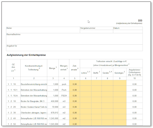 Aufgliederung der einheitspreise entsprechend formblatt 223.